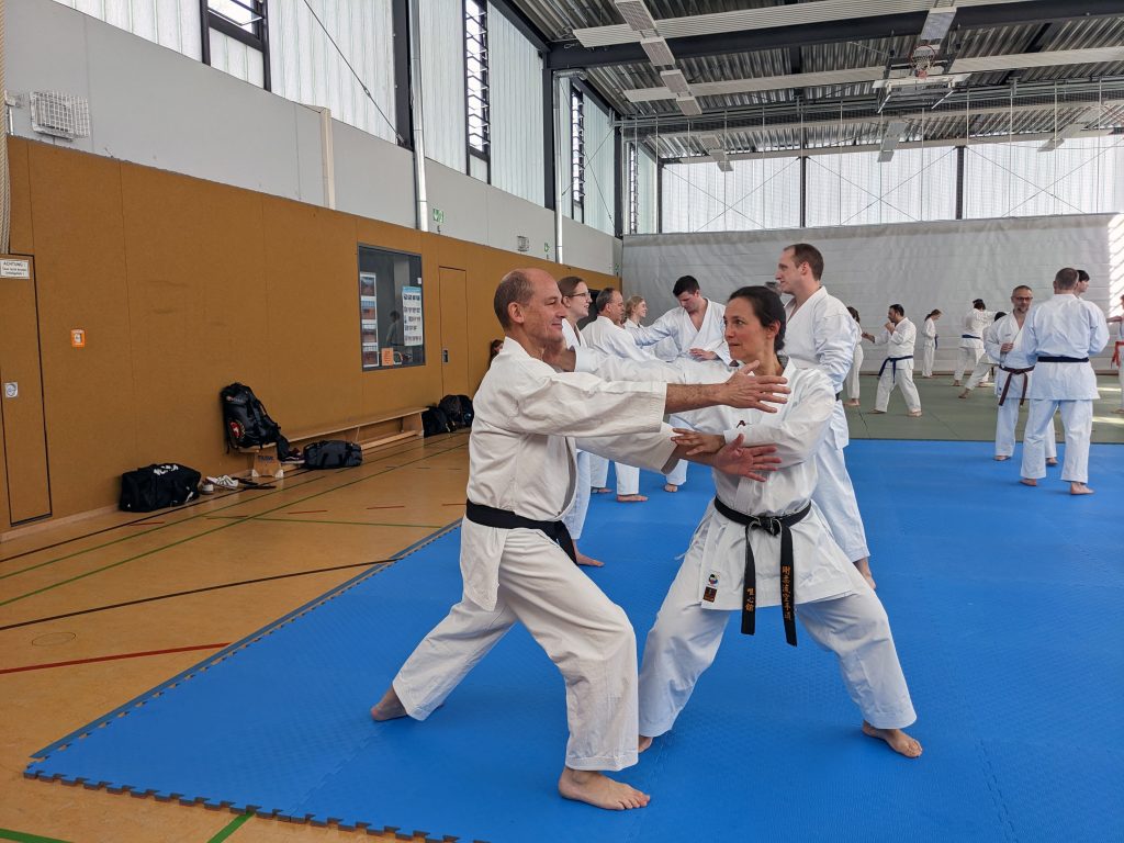 In der ersten Einheit führte Ludger Niemann (7. Dan) die Teilnehmer:innen über Grundschule und Ausschnitten aus verschiedenen Katas zu wichtigen Selbstverteidigungsaspekten wie seitliches Ausweichen und gleichzeitiges Ausführen von Abwehr- und Angriffstechniken.