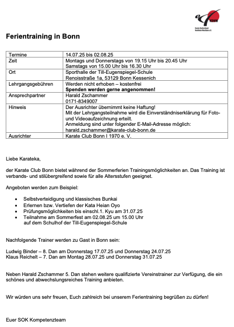 Mitzubringen sind zu allen vier Terminen Karate-Gi bzw. Trainingsanzug und Turnschuhe, Schreibzeug und DKV-Pass.