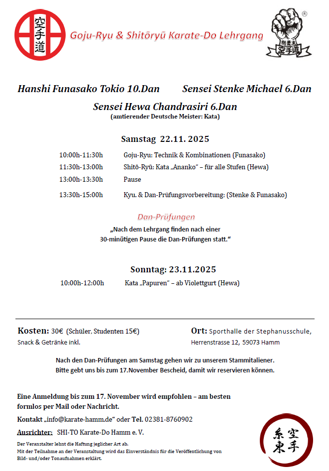 Mitzubringen sind zu allen vier Terminen Karate-Gi bzw. Trainingsanzug und Turnschuhe, Schreibzeug und DKV-Pass.