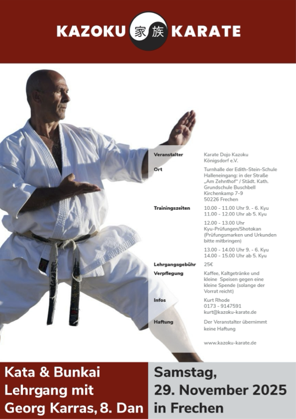 Mitzubringen sind zu allen vier Terminen Karate-Gi bzw. Trainingsanzug und Turnschuhe, Schreibzeug und DKV-Pass.