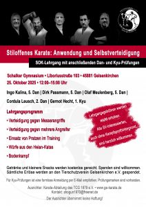 Mitzubringen sind zu allen vier Terminen Karate-Gi bzw. Trainingsanzug und Turnschuhe, Schreibzeug und DKV-Pass.
