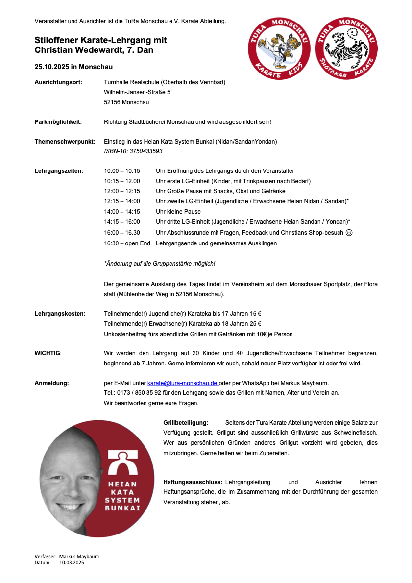 Mitzubringen sind zu allen vier Terminen Karate-Gi bzw. Trainingsanzug und Turnschuhe, Schreibzeug und DKV-Pass.