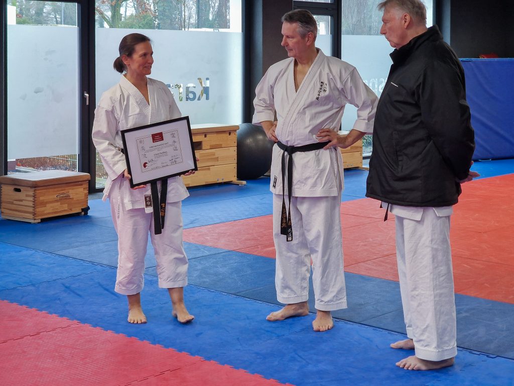 Zum feierlichen Ende der Veranstaltung erhielt Ulrich Heckhuis (9. Dan) die Ehrenmitgliedschaftsurkunde des GKD (Goju-Ryu Karate Bund Deutschland e.V.) überreicht. Judith Niemann, zwei Wochen vorher zur Präsidentin des GKD gewählt, hielt eine kleine Laudatio. Ulrich Heckhuis hat vor 40 Jahren gemeinsam mit Hartmut Sauer, Frank Beeking und Fritz Nöpel für den GKD bzw. für das Goju-Ryu Karate an den Fusionsverhandlungen zum Deutschen Karate Verband mitgewirkt. Im GKD war er in verschiedenen Funktionen tätig, als Kampfrichterobmann, als Lehrwart und schließlich über Jahrzehnte als Vizepräsident. Während dieser Zeit war er zudem parallel DKV-Vizepräsident und Präsident des KDNW.