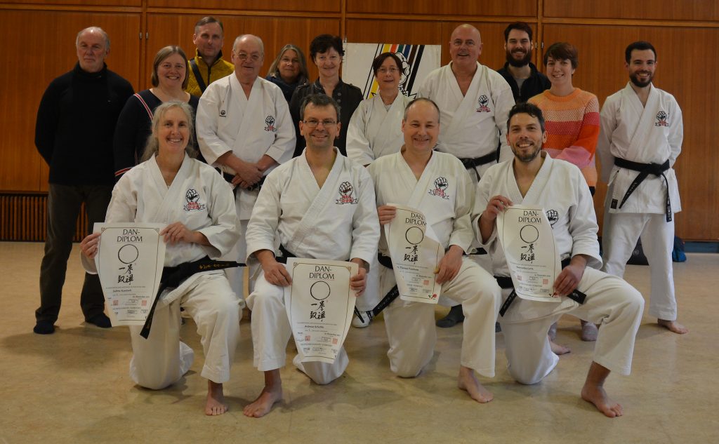 Zum 1. Dan: Anna-Maria Bader, Ute Gallwas, Nicole Hamelung, Timur Manasbayev, Jolina Quester, Norbert Rose, Tobias Schälte, Nicola von Tessin